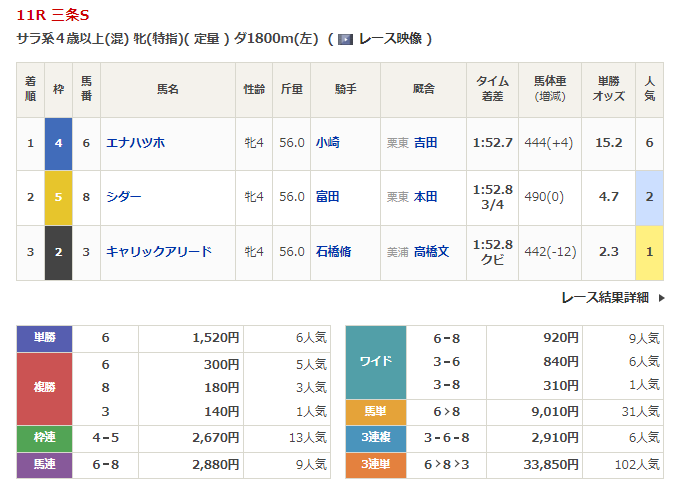 ◎エナハツホ(6人気)1着 単勝1,520円、複勝300円