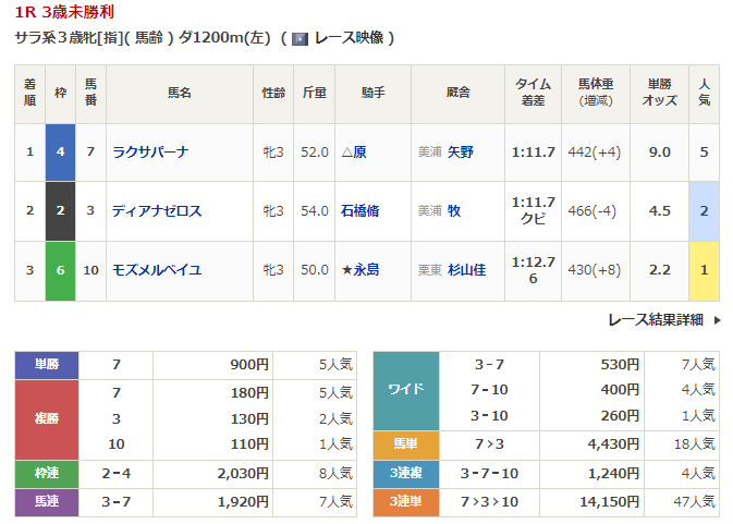 ◎ラクサパーナ(5人気)1着 単勝900円、複勝180円 - 4/30【新潟3R】3歳未勝利
