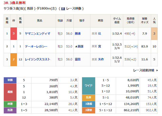 ◎エナハツホ(6人気)1着 単勝1,520円、複勝300円 - 4/30【東京1R】3歳未勝利