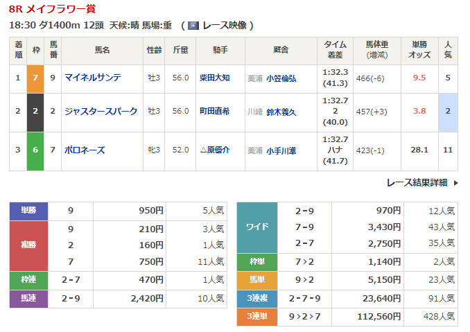 このレースでは穴馬の◎マイネルサンテ(5番人気)が1着、もう1頭の穴馬だった◎ポロネーズ(11番人気)3着に入りました。相手馬の★ジャスタースパーク(2番人気)が2着に入り3連単は112,560円の配当となりました。