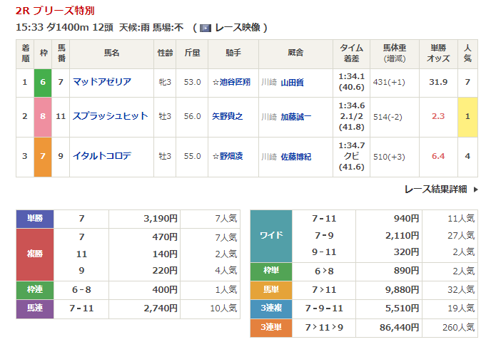 ◎マッドアゼリア(7人気)1着 単勝3,190円、複勝470円