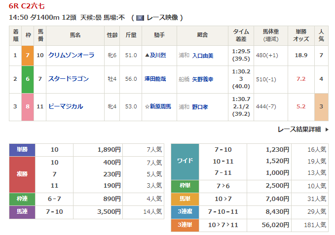 ◎クリムゾンオーラ(7人気)1着 単勝1,890円、複勝400円
