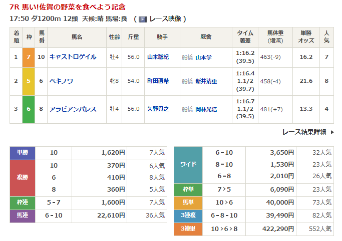 ◎キャストロゲイル(7人気)1着 単勝1,620円、複勝370円