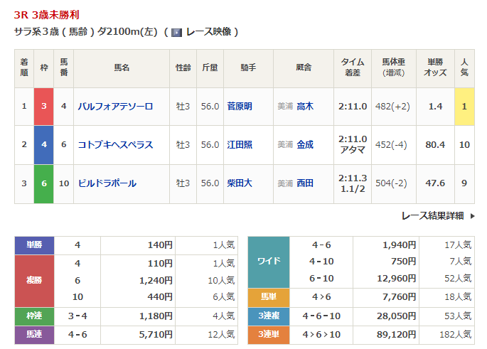 ◎バサラ(7人気)3着 複勝460円 - 6/11【函館6R】3歳未勝利