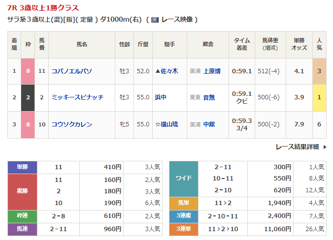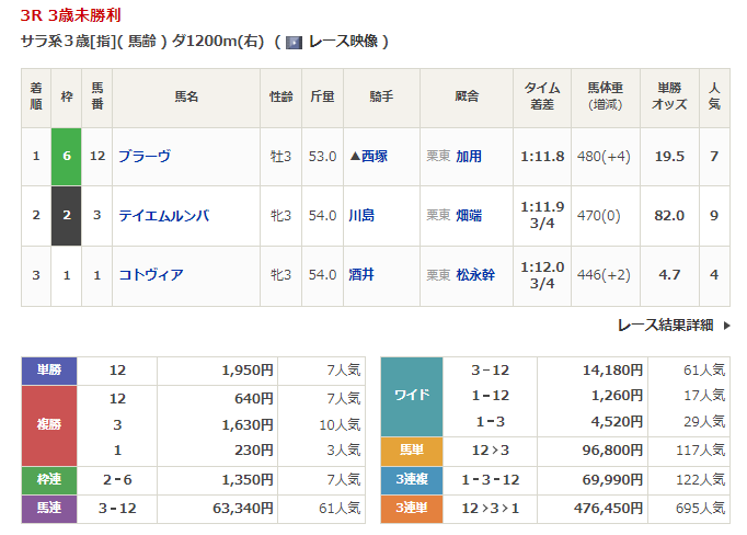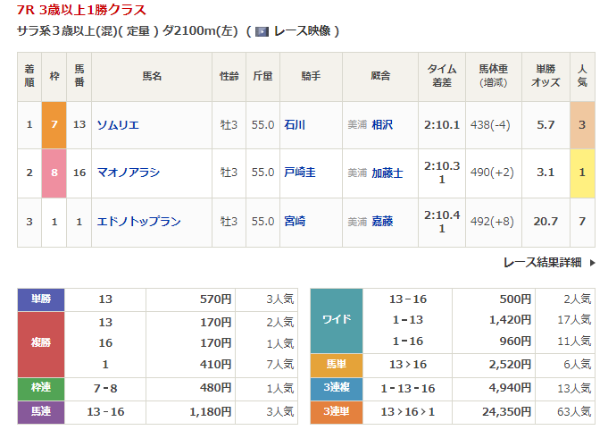 ◎ブラーヴ(7人気)1着 単勝1,950円、複勝640円