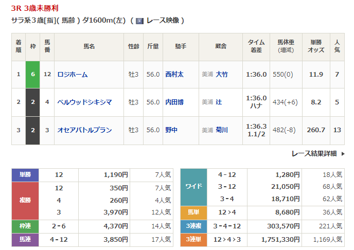 ◎ロジホーム(7人気)1着 単勝1,190円、複勝350円