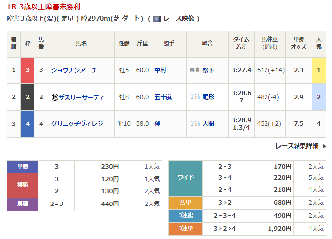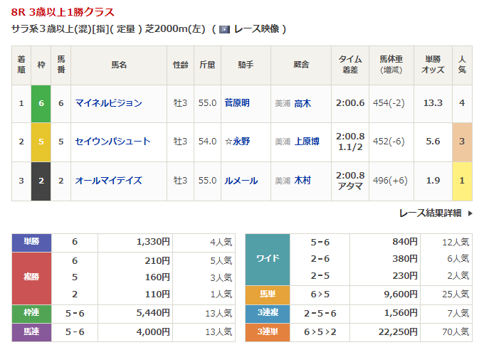 ◎マイネルビジョン(4人気)1着 単勝1,330円、複勝210円