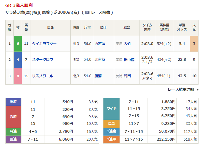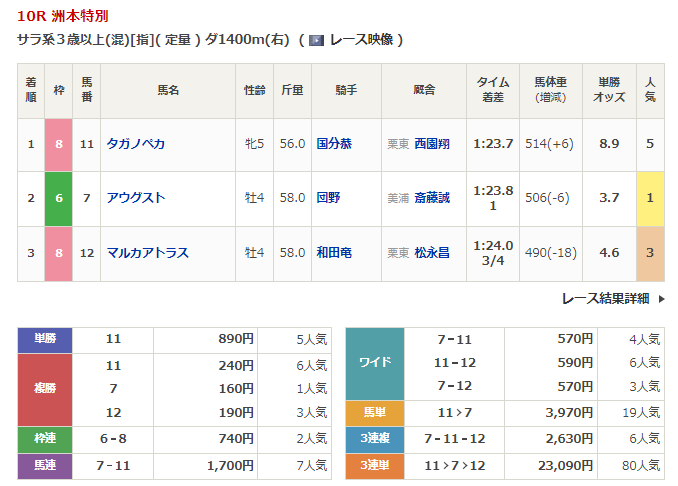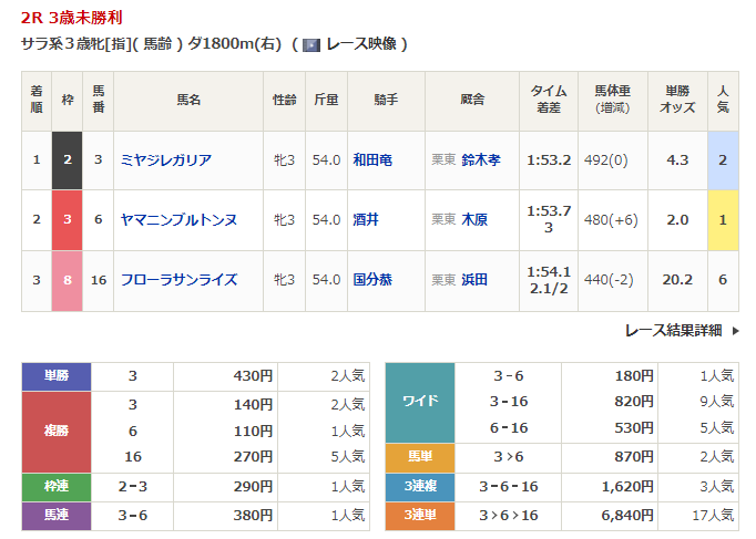 このレースでは相手馬の★セレスティアリティ(1番人気)1着に入りましたが、2着に穴馬の◎ウォーターフルール(8番人気)、3着にもう1頭の穴馬だった◎メイショウタクボク(15番人気)が入りました。人気薄の穴馬が2頭馬券内に入ったことで3連複は69,330円、3連単は225,350円と20万円を超える高額配当となりました。