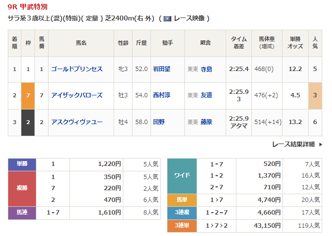 ◎ゴールドプリンセス(5人気)1着 単勝1,220円、複勝350円