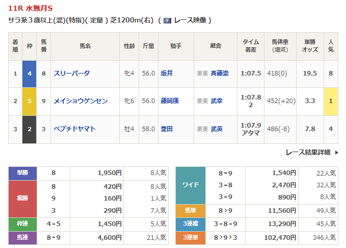 ◎スリーパーダ(8人気)1着 単勝1,950円、複勝420円
