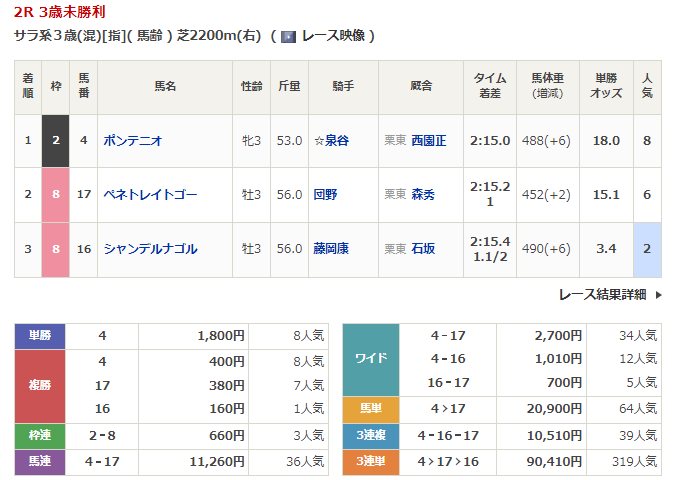 ◎ポンテニオ(8人気)1着 単勝1,800円、複勝400円