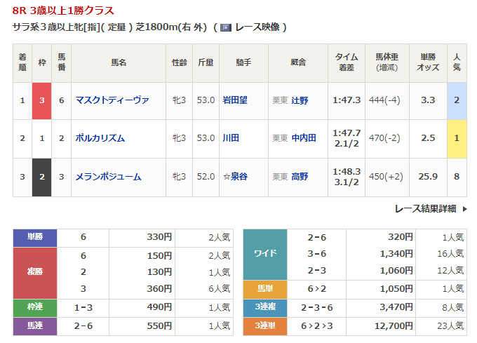ここでは1着に★ミヤビ(1番人気)、2着に★アルジーヌ(3番人気)と相手馬同士の決着も、3着には穴馬の◎マスキュリン(10番人気)が入ったことで3連複は15,560円、3連単は65,230円の配当となりました。