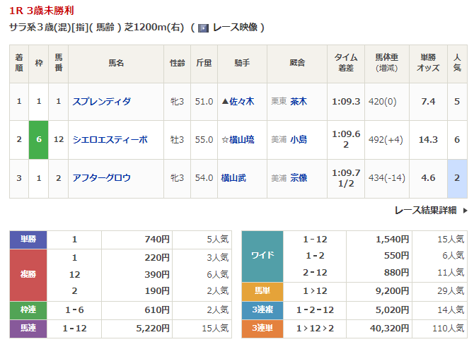 ◎スプレンディダ(5人気)1着 単勝740円、複勝220円