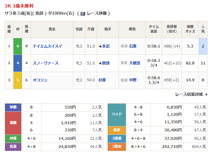 ◎テイエムスイスイ(2人気)1着 単勝530円、複勝200円