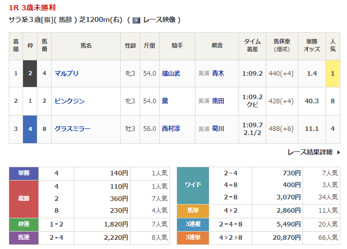 ◎ベルウッドシキシマ(5人気)2着 複勝260円