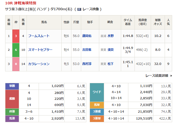 ◎マスキュリン(10人気)3着 複勝880円 - 6/11【函館10R】津軽海峡特別
