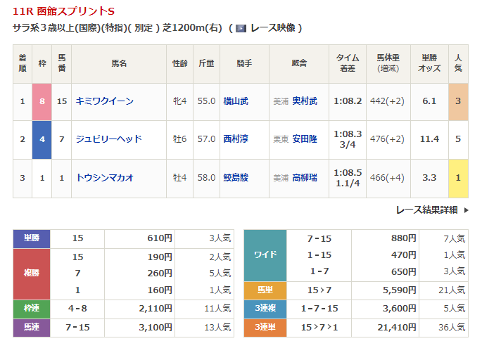 ◎テイエムスイスイ(2人気)1着 単勝530円、複勝200円 - 6/10【函館7R】3歳以上1勝クラス