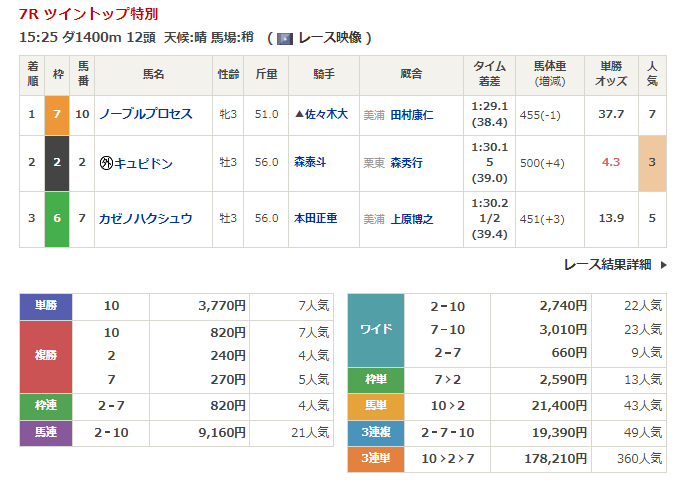 ◎ノーブルプロセス(7人気)1着 単勝3,770円、複勝820円