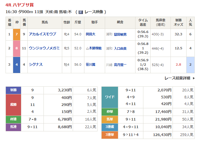 ◎アカルイスモウブ(6人気)1着 単勝3,230円、複勝400円