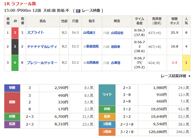 ◎スプライト(8人気)1着 単勝2,590円、複勝490円