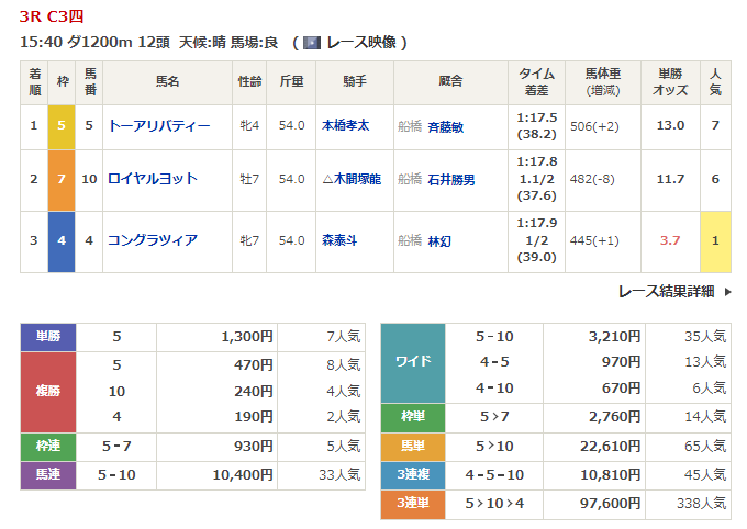 このレースでは◎トーアリバティー(7番人気)1着、◎ロイヤルヨット(6番人気)2着と穴馬同士のワンツー決着となりました。3着には相手馬の★コングラツィア(1番人気)が入り3連単は97,600円の配当となりました。