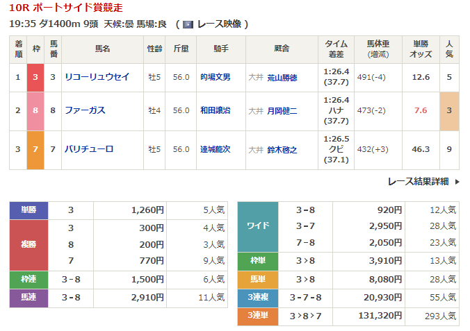 このレースでも穴馬の◎リコーリュウセイ(5番人気)1着、2着には相手馬の★ファーガス(3番人気)、3着には◎バリチューロ(9番人気)が入り3連単は131,320円の高額配当に繋がりました。