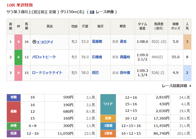 ◎エコロアイ(4人気)2着 複勝310円 - 7/2【福島11R】ラジオNIKKEI賞