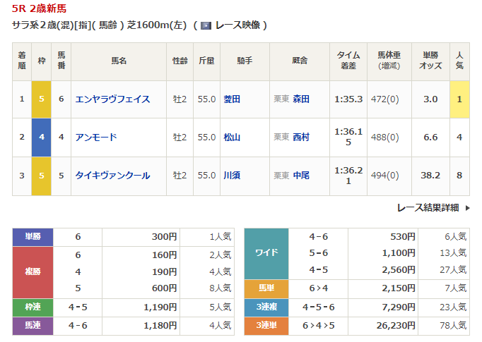 ◎カヨウネンカ(5人気)1着 単勝1,280円、複勝220円