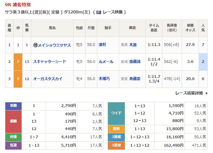◎メイショウミツヤス(7人気)1着 単勝2,790円、複勝490円