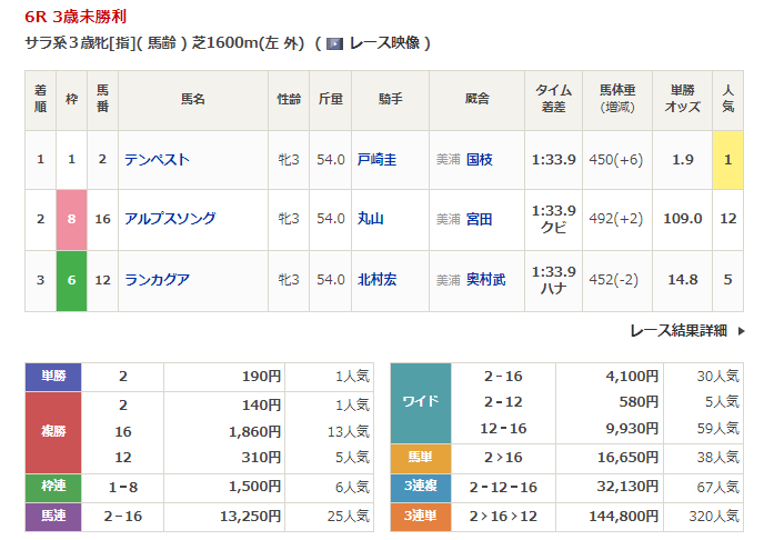 このレースでは1着には相手馬の★テンペスト(1番人気)が入りましたが、2着に穴馬の◎アルプスソング(12番人気)、3着にも◎ランカグア(5番人気)が入りました。二桁人気の穴馬が絡んだことで馬連配当は13,250円、3連複は32,130円、3連単は144,800円の高配当の結果となりました。