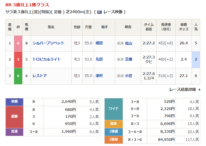 ◎シルバープリペット(5人気)1着 単勝2,640円、複勝680円