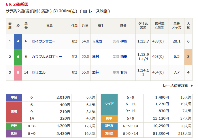 ◎セイウンサニー(6人気)1着 単勝2,010円、複勝400円
