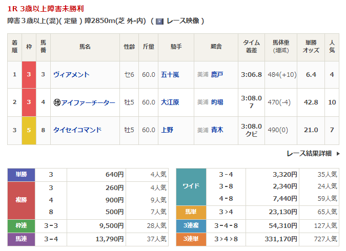◎トニトゥルス(6人気)3着 複勝240円 - 8/19【新潟1R】3歳以上障害未勝利