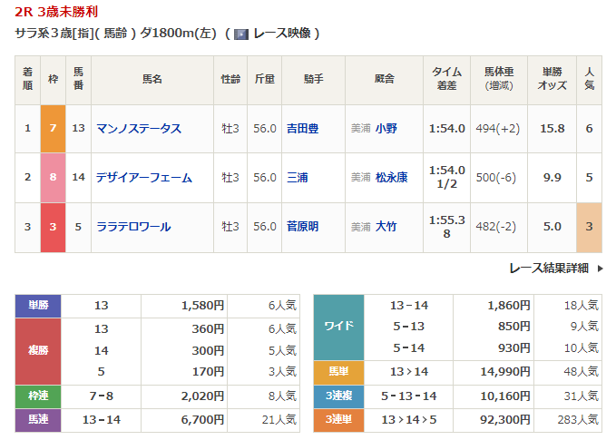 ◎マンノステータス(6人気)1着 単勝1,580円、複勝360円