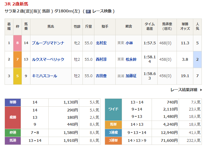 ◎ブループリマドンナ(5人気)1着 単勝1,130円、複勝290円
