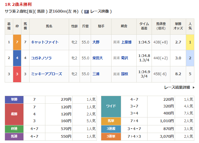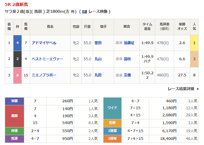 ◎マイヨアポア(7人気)1着 単勝1,600円、複勝370円 - 8/12【小倉2R】2歳未勝利