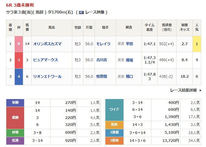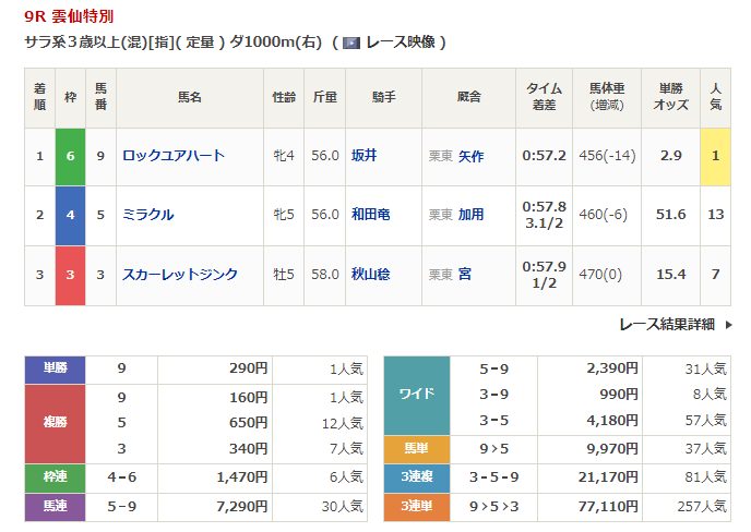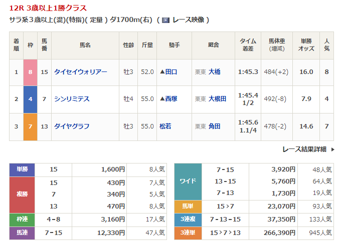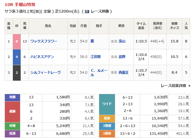 このレースでは1着には相手馬の★テンペスト(1番人気)が入りましたが、2着に穴馬の◎アルプスソング(12番人気)、3着にも◎ランカグア(5番人気)が入りました。二桁人気の穴馬が絡んだことで馬連配当は13,250円、3連複は32,130円、3連単は144,800円の高配当の結果となりました。