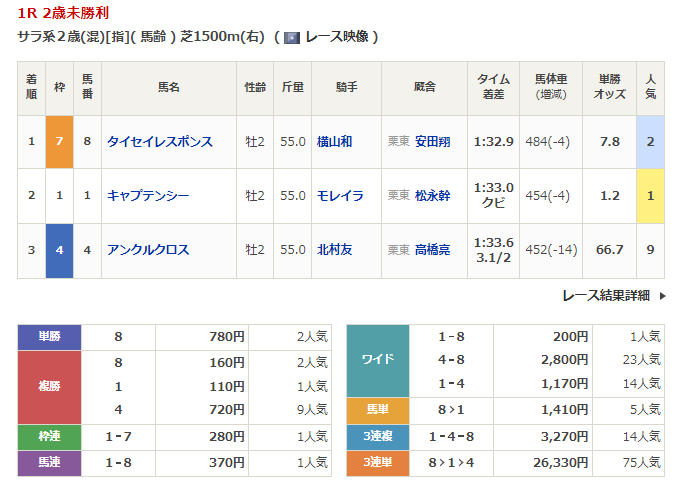 ◎コスモディナー(4人気)1着 単勝800円、複勝210円
