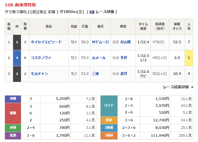 ◎タイセイエピソード(7人気)1着 単勝5,250円、複勝660円