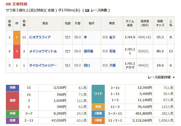 ◎ビオグラフィア(8人気)1着 単勝3,530円、複勝760円