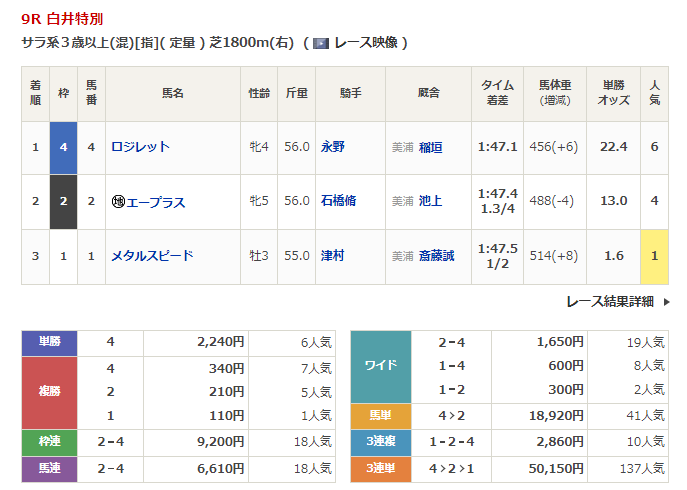 ◎ロジレット(6人気)1着 単勝2,240円、複勝340円