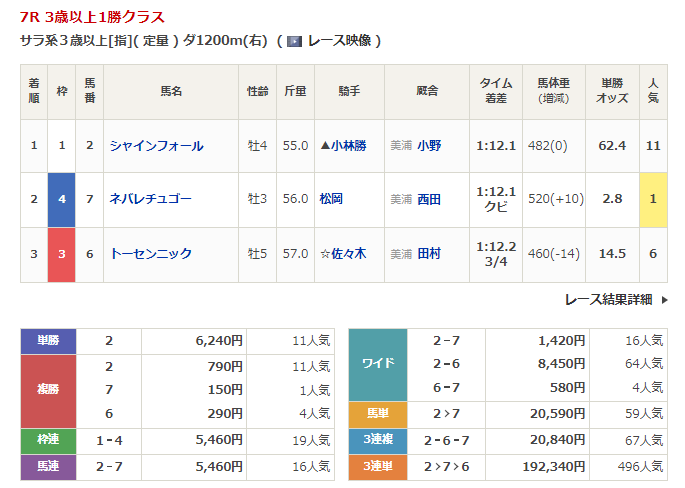◎シャインフォール(11人気)1着 単勝6,240円、複勝790円