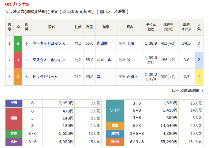 ◎オーキッドロマンス(7人気)1着 単勝3,450円、複勝470円 - 9/23【中山11R】ながつきステークス