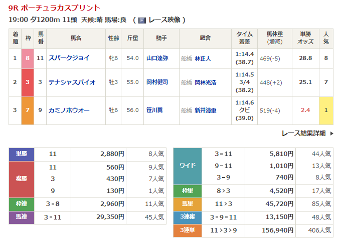 ◎スパークジョイ(8人気)1着 単勝2,880円、複勝560円