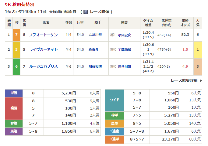 的中数を重ねらながらも9月は人気薄の単勝的中や相手馬との組合わせでは10万を超える高額配当の的中もありました。以下は先月の開催で相手馬との組合わせで高配当に繋がったレースをご紹介します。