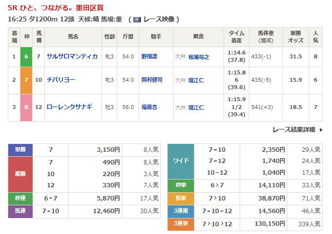 ◎ノーモアワーズ(7人気)1着 単勝1,910円、複勝340円