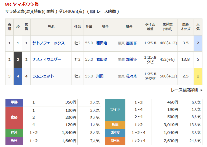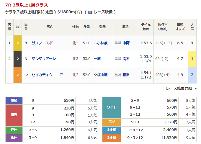 ◎サノノエスポ(4人気)1着 単勝650円、複勝230円
