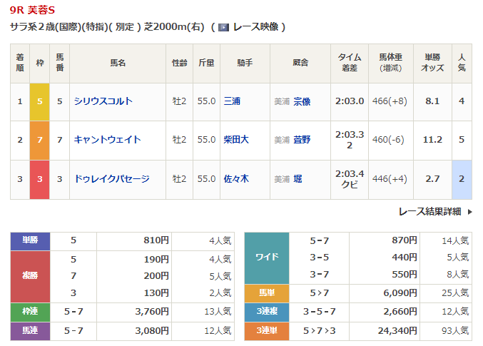 ◎ソウテン(8人気)2着 複勝330円 - 9/2【札幌11R】札幌2歳ステークス