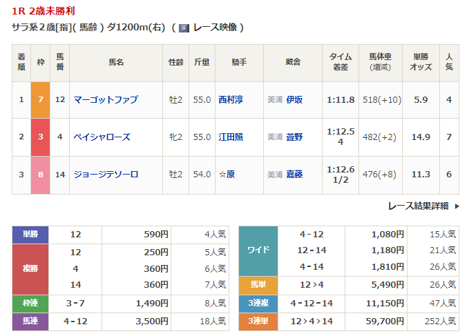 ◎マーゴットファブ(4人気)1着 単勝590円、複勝250円