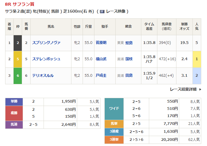 ◎スプリングノヴァ(5人気)1着 単勝1,950円、複勝630円
